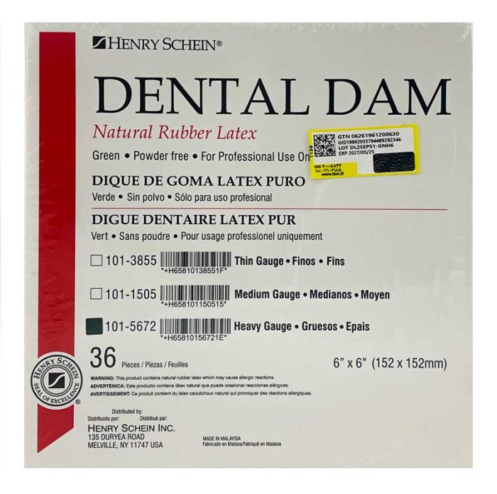 لاستیک رابردم هنری شاین (Henry Schein Rubberdam) یک سد لاستیکی باکیفیت آمریکایی است که بهطور تخصصی برای ایزولهسازی و کنترل رطوبت در درمانهای دندانپزشکی طراحی شده است. این محصول از جنس لاتکس (Heavy – Green) بوده و در بستههای 36 عددی عرضه میشود.