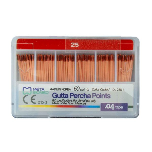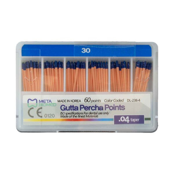 گوتا پرکا ۴ درصد متا (META Gutta Percha Cones 4%) یکی از دقیقترین و محبوبترین مواد پرکننده کانال ریشه در درمانهای اندودنتیک است که توسط شرکت مطرح META Biomed کره جنوبی طراحی و تولید شده است.