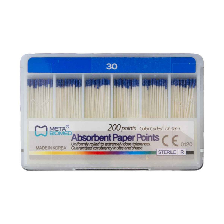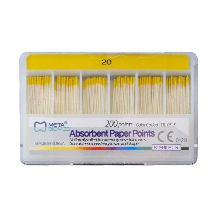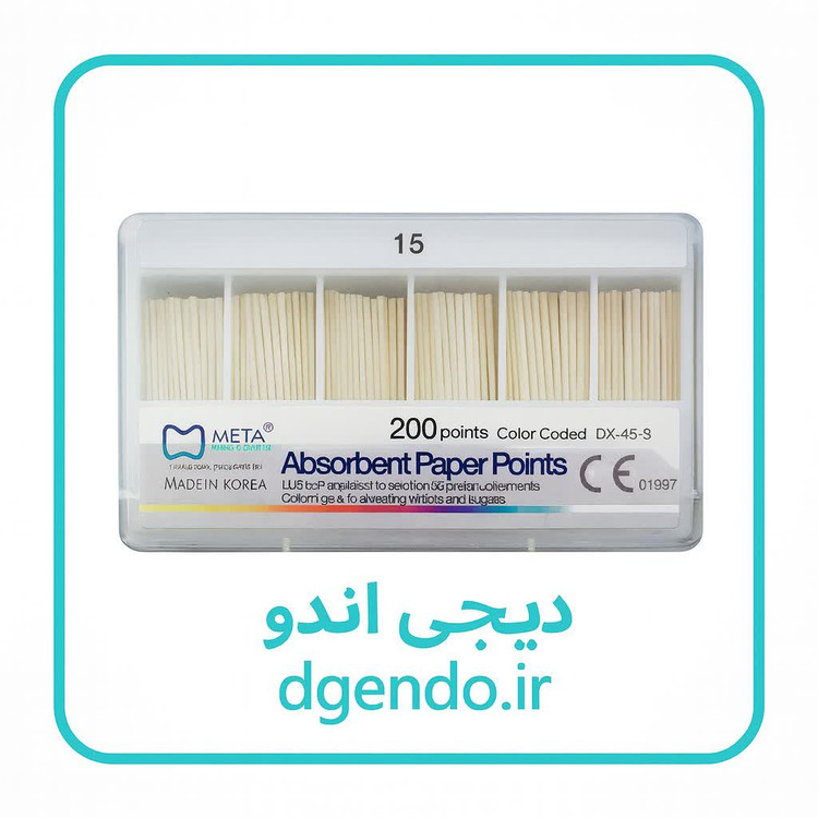 کن کاغذی ۲ درصد متا (Meta Biomed Absorbent Paper Points 0.02) ابزار استاندارد و دقیق برای خشککردن کانال ریشه پس از شستوشو و قبل از سیل نهایی است. این پوینتهای جاذب با Taper استاندارد ۲٪ (0.02) و سایزبندی ISO تولید میشوند تا با آمادهسازیهای دستی و روتاری سازگار بوده و فیت دقیق در طول کانال فراهم شود.